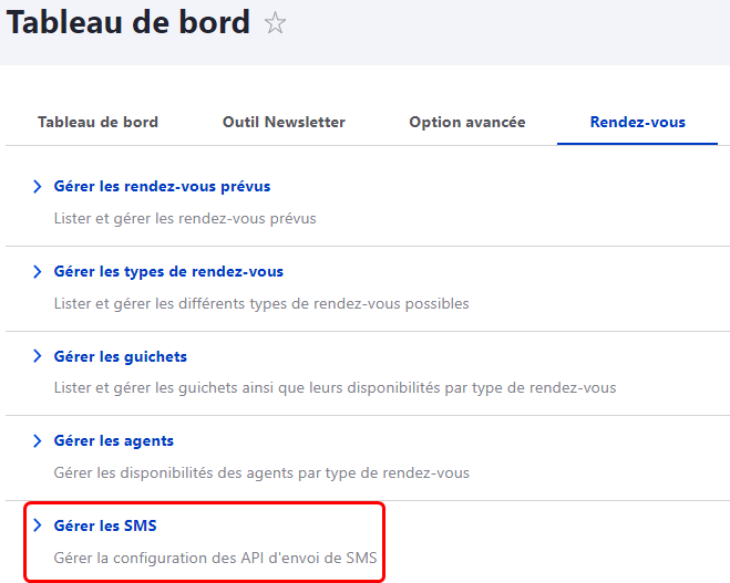 1. Après avoir choisi et contacté le prestataire parmi les trois proposés ci-dessus, cliquez sur "Gérer les SMS" pour gérer l'option SMS.