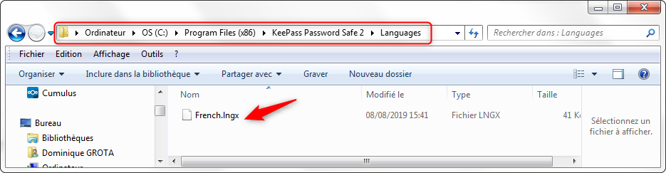 Copiez le fichier French.Ingx dans le sous -dossier "langages" du programme Keepas. (emplacement par défaut : C:\Program Files (x86)\KeePass Password Safe 2\Languages)