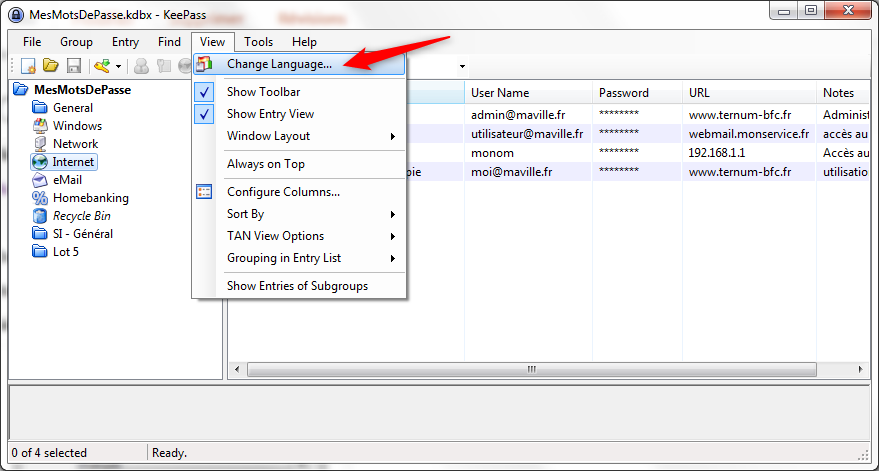 Lancez l'application Keepass, rendez-vous dans le menu view, Change language...
