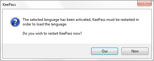 Cliquez sur Oui pour redémarrer Keepass et le passage aux menus en français
