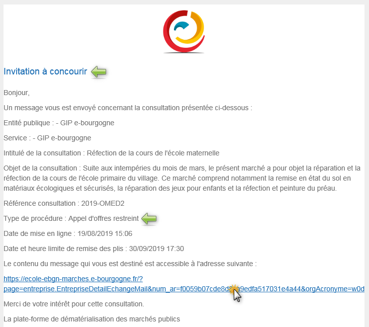 Une consultation restreinte n'est pas visible du grand public sur la Salle des Marchés. Il faut un code pour y accéder. Ce code vous est envoyé par l'acheteur via la messagerie sécurisée. Exemple ci-dessous du contenu du courriel automatique. Cliquez sur le lien pour accéder au message, au code d'accès et au lien direct vers la consultation en question.