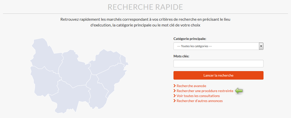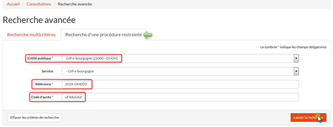 Ou depuis la page de recherche avancée, cliquez sur l'onglet "Recherche d'une procédure restreinte".