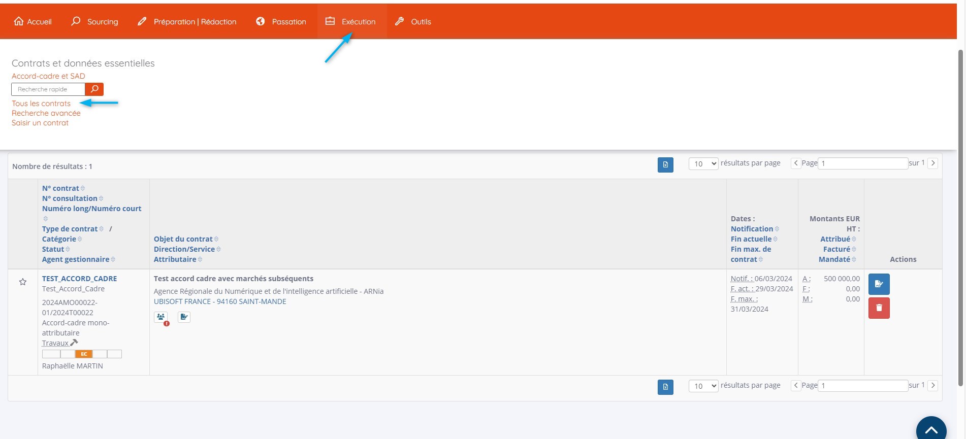 Pour accédez à la numération de notre contrat, cliquez sur "exécution", puis "tous les contrats" pour accéder à votre tableau de bord.