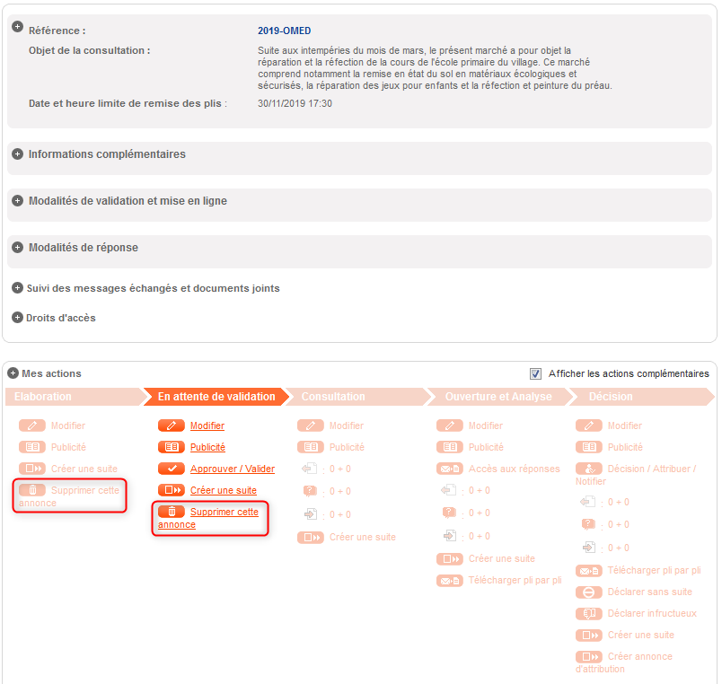 Il n'est possible de supprimer une consultation qu'au deux premières étapes du processus achats de la Salle des Marchés :