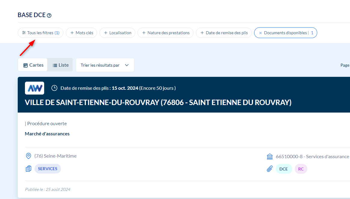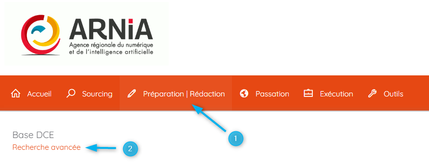 Sélectionnez ensuite la rubrique "Préparation et rédaction" > "Base DCE" > "Recherche avancée".