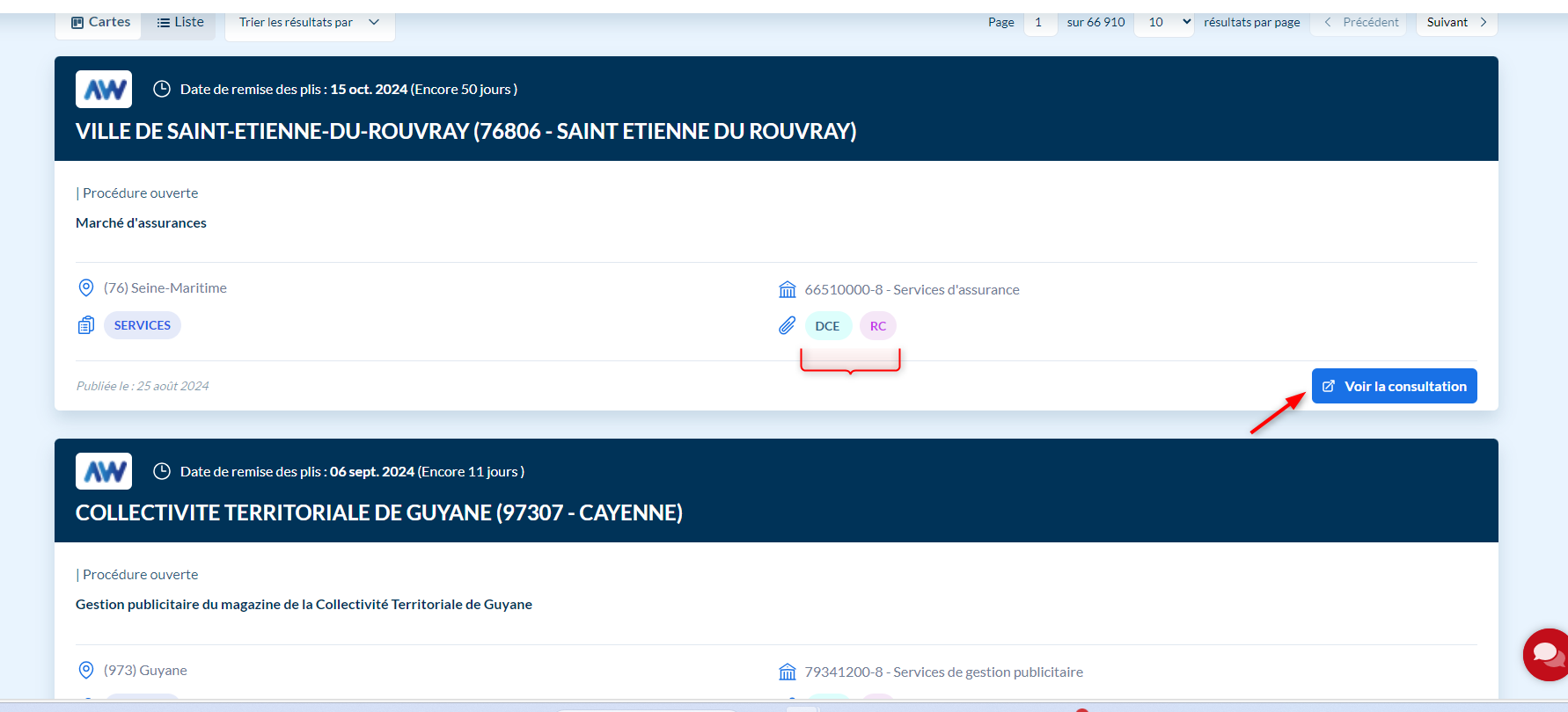 Cliquez le bouton "voir la consultation" se trouvant sur la droite pour accéder à la totalité des pièces du marché (ou sur DCE / RC ).