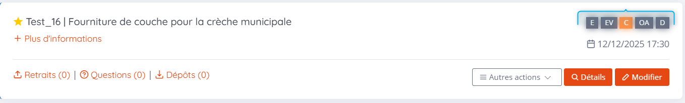 Salle des marchés Mise à jour le 24-12-2025 Votre consultation est désormais publiée et donc à l'état de "C" consultation. Retrouvez les étapes ci-dessous qui vous permettent de modifier votre marché en cours d'exécution.