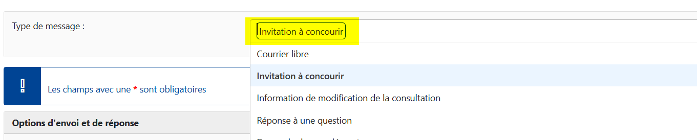 Renseignez le type de message en premier en choisissant "invitation à concourir" dans la liste déroulante :