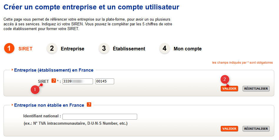 Renseignez le SIRET de votre entreprise (ou l'identifiant national si le siège n'est pas situé en France), puis validez :