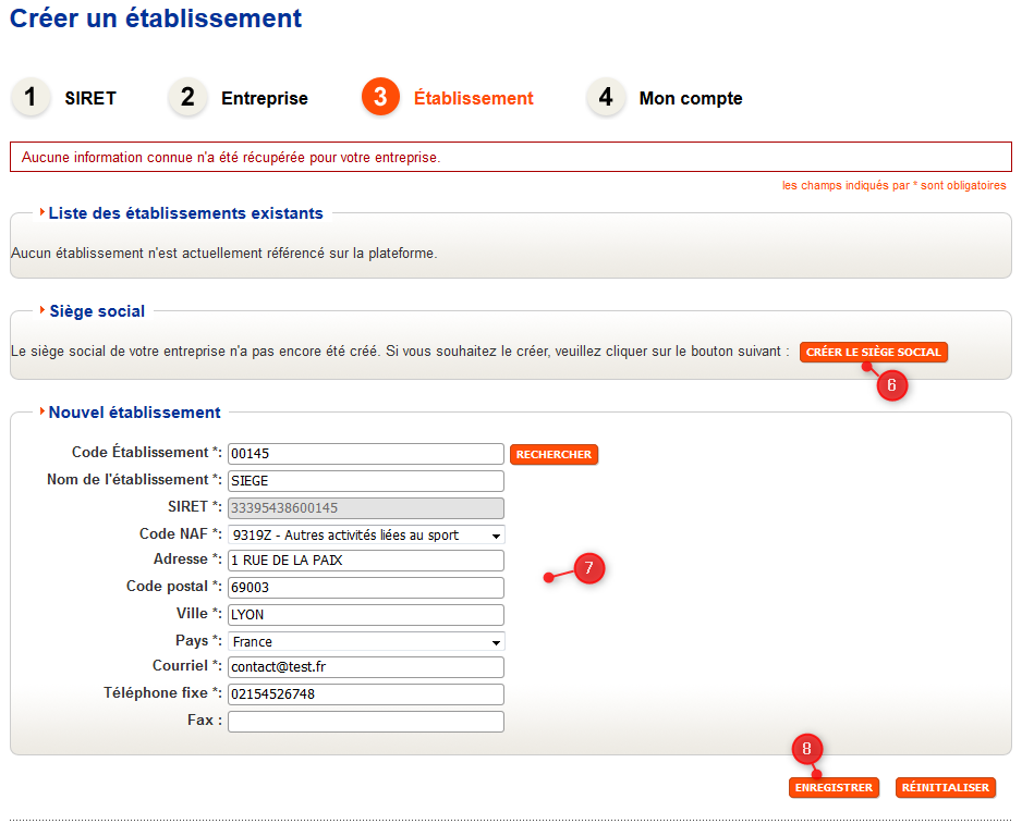 A l'écran suivant, si le siège n'a pas été pré-rempli automatiquement, renseignez-le. Saisissez aussi ici les établissements rattachés au siège.
