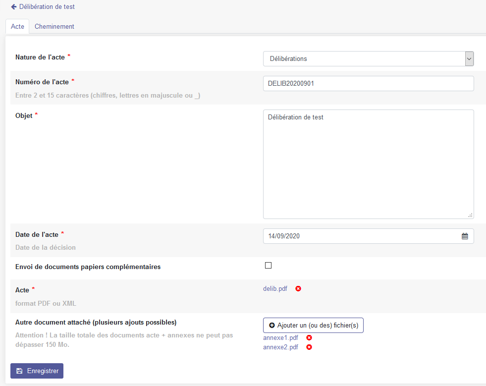 - Acte : il s'agit de l'acte en lui-même, le fichier principal. Il doit être envoyé au format PDF.