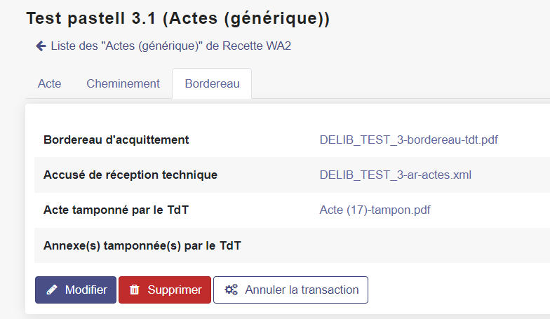 Si le formulaire a été correctement rempli, qu'aucun champ obligatoire n'a été omis notamment, Pastell propose des actions possibles, notamment l'action "transmettre au TDT"