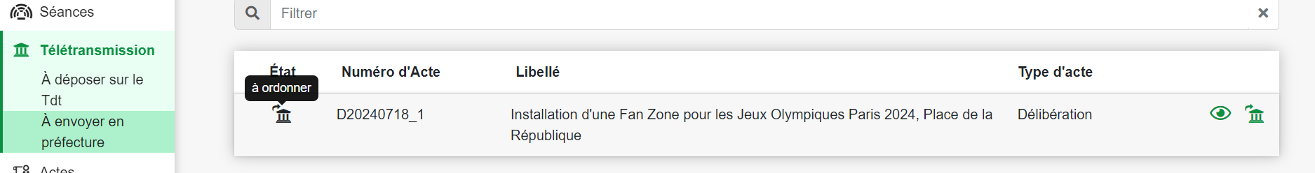 Ensuite, l'acte se retrouve dans la bannette "A envoyer en préfecture", à l'état "à ordonner".