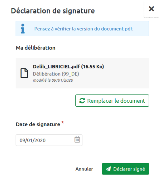 L'action de déclarer signé permet d'indiquer que l'acte a été signé en dehors de l'application. Le document principal du projet doit donc être remplacé par le document PDF de l'acte définitif (exemple : la délibération) avant la déclaration de la signature, car c'est ce document déclaré signé qui sera considéré comme l'acte définitif, et envoyé à la préfecture si il est télétransmissible.