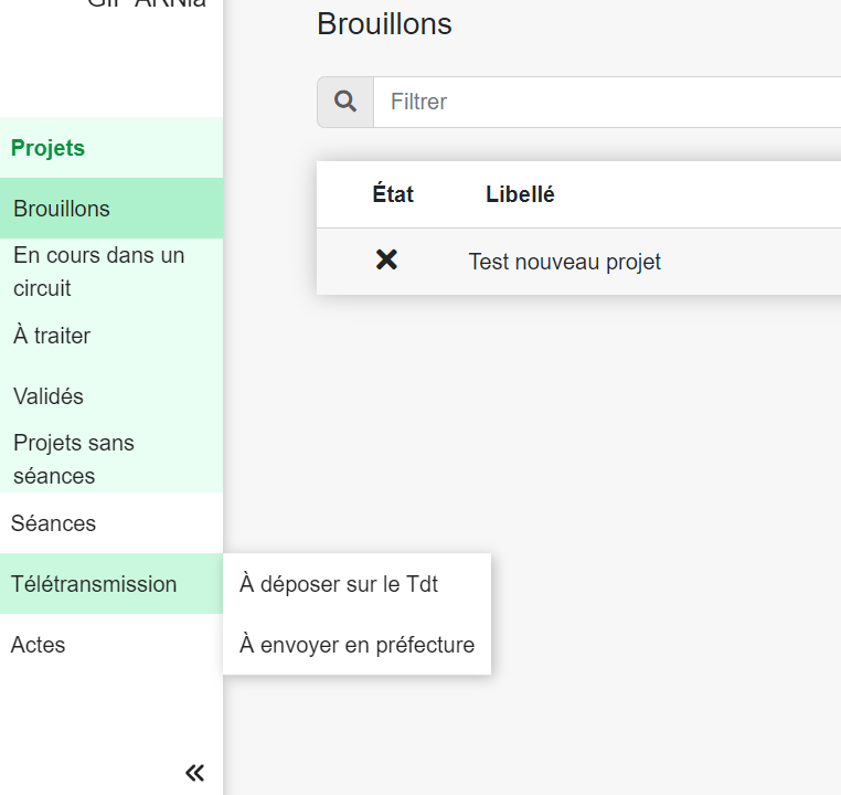 Une fois l'acte déclaré signé / signé, vous pourrez le retrouver dans le menu de gauche, "Télétransmission". Il apparait dans la bannette "A déposer sur le tdt".