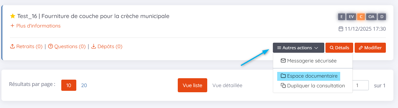Après avoir recherché votre marché, accédez à votre espace documentaire via le menu "autres actions", puis en sélectionnant "espace documentaire".