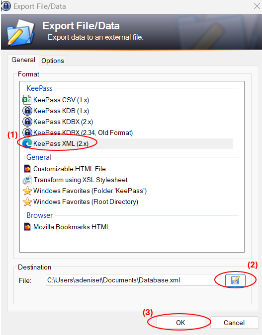 - Dans la fenêtre venant de s'ouvrir, choisir l'option KeePass XML (1)