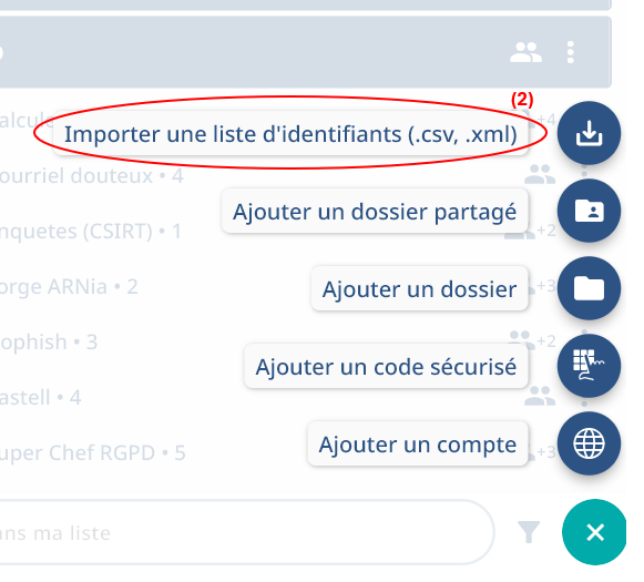 - Cliquer sur + (1), puis Importer une liste d'identifiants (.csv) (2)