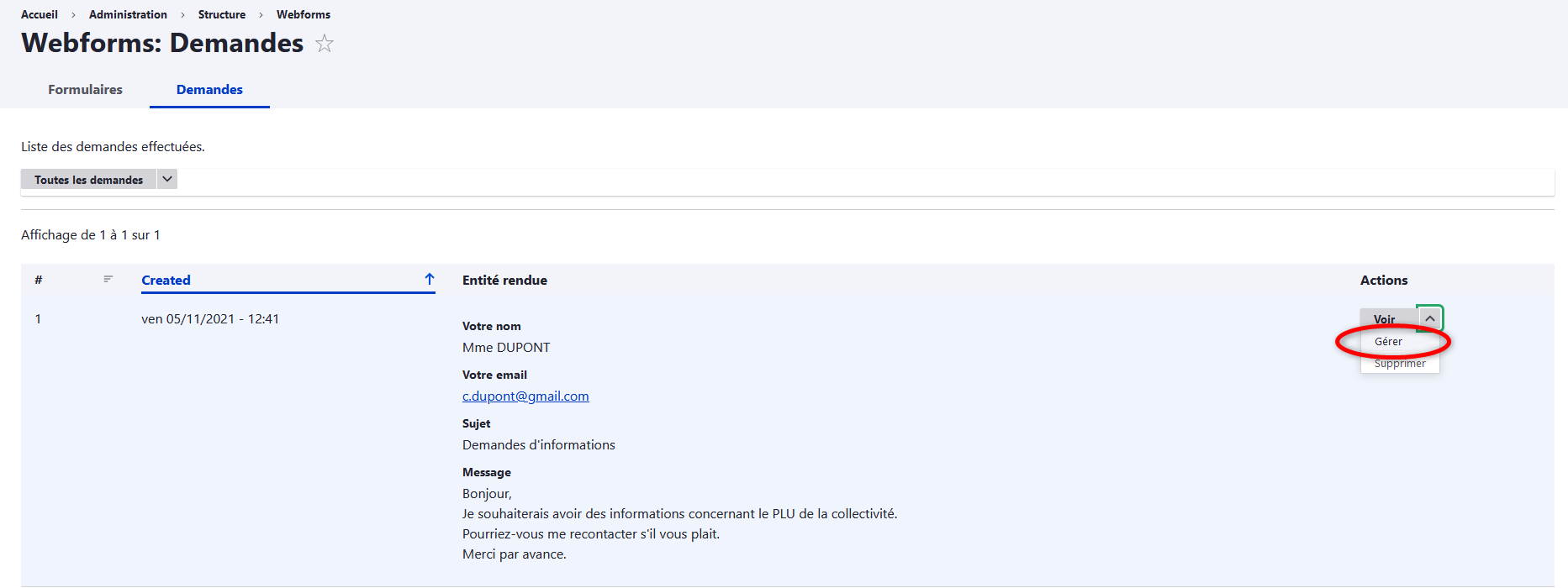 Pour traiter la demande, cliquez sur la flèche à côté de "voir" et choisissez "gérer".