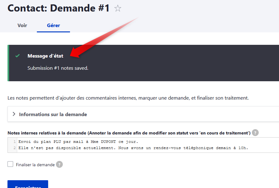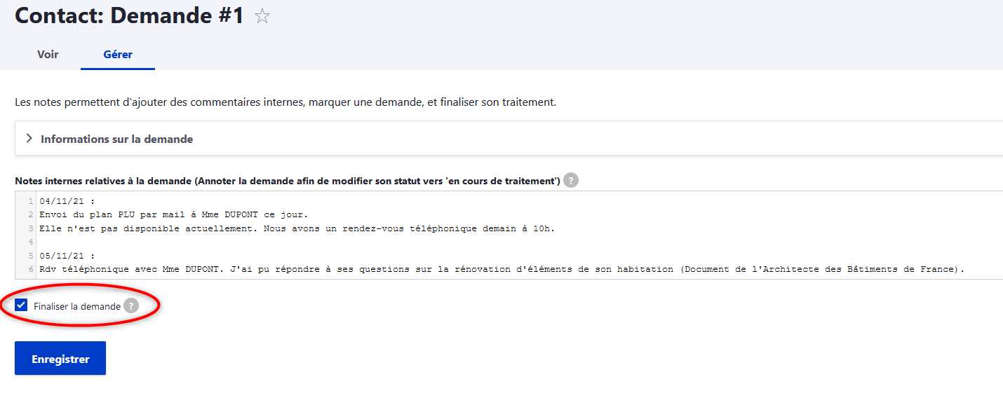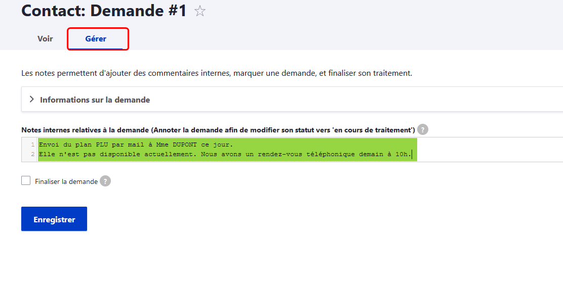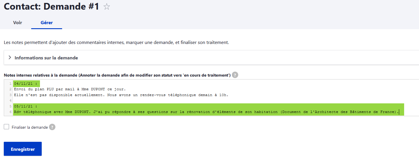Vous pouvez, ici, ajouter des informations sur le suivi de la demande avec, par exemple, la date de traitement et les actions menées, puis enregistrer.