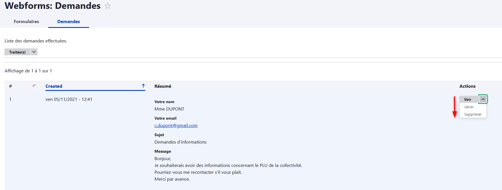 Dans les demandes traitées, vous retrouvez les demandes d'origines que vous pourrez consulter, gérer à nouveau si besoin ou supprimer.