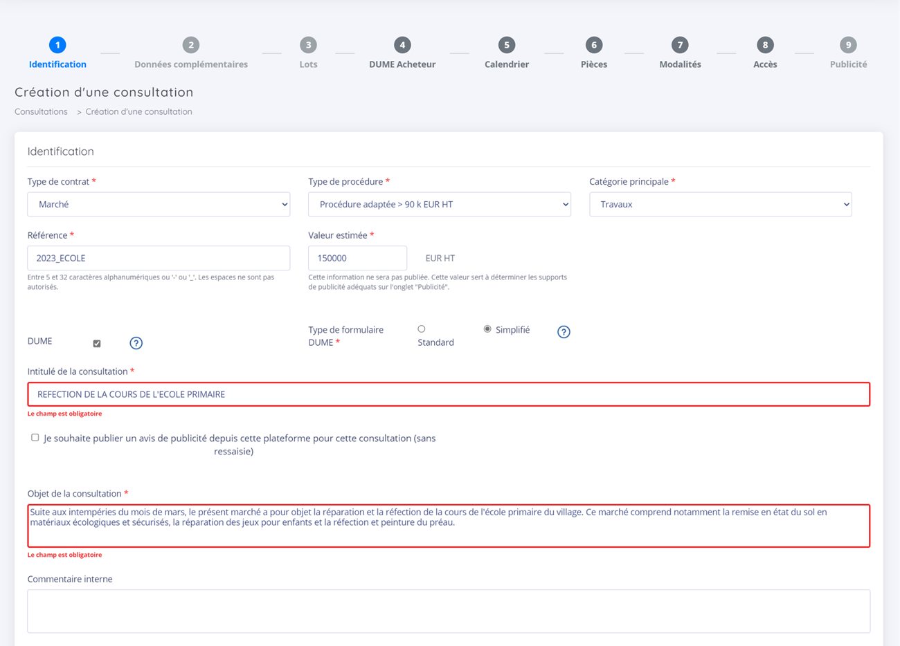 Ici, consultation non allotie, avis publié sans passer par la plateforme et sans DUME Acheteur :