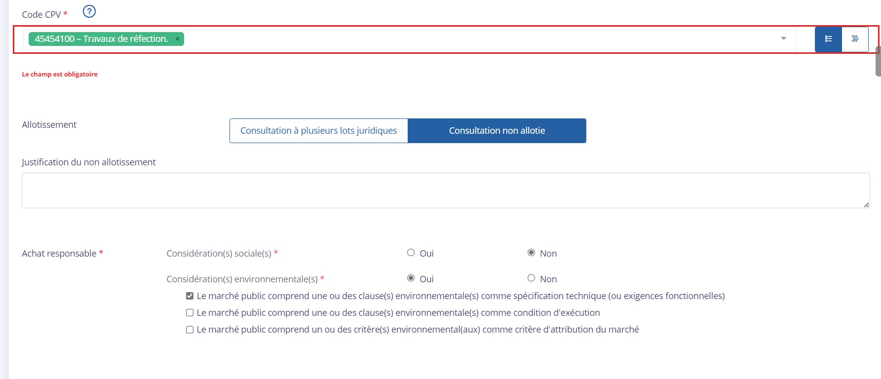 Puis, précisez si votre marché est alloti ou non. Si celui-ci ne l'est pas, justifiez le non allotissement.