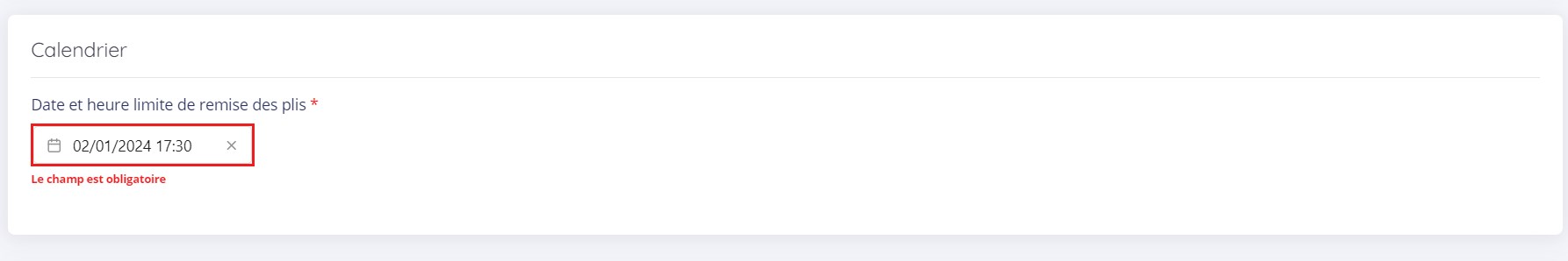 Indiquez la date limite de remise des offres pour votre consultation. Utilisez l'icône "calendrier" pour sélectionner la date ou saisissez la en respectant ce format jj/mm/aaaa hh:mm.