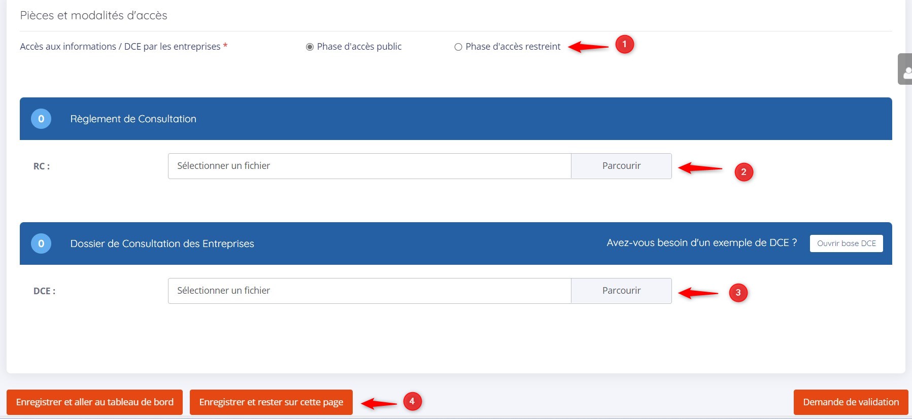 Renseignez ici les modalités d'accès et insérez les pièces de votre DCE (voir capture d'écran ci-dessous) :