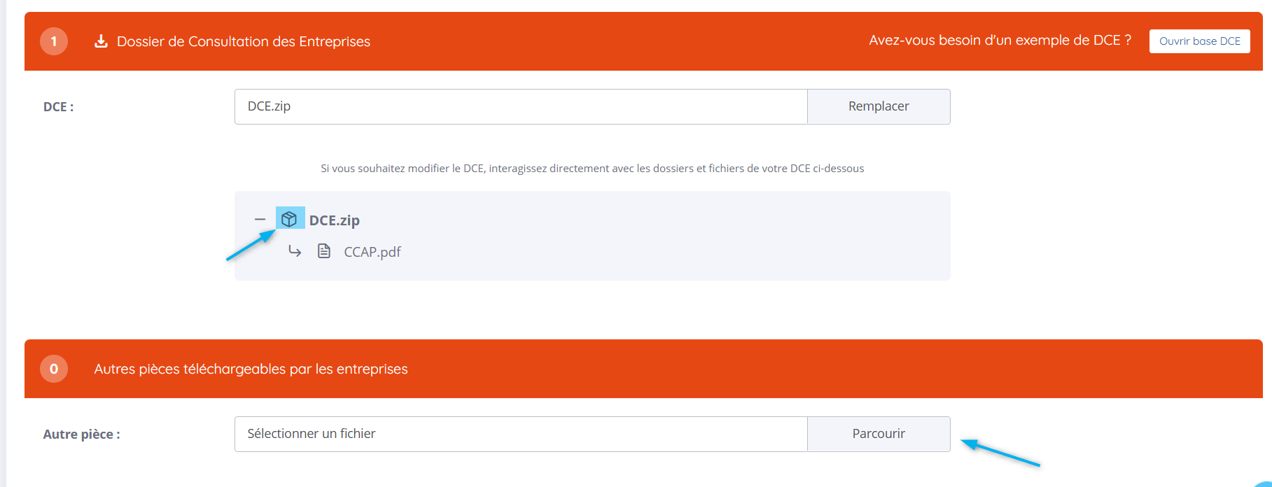 Cliquez sur le pictogramme "cube" pour ajouter une pièce dans le DCE d'origine, ou alors, insérez un document dans le bloc "autres pièces téléchargeables par les entreprises".