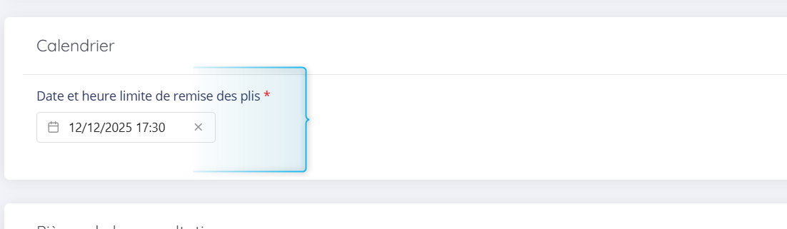 Pour modifier la date et heure limite de remise des plis, il vous suffit de changer ces éléments dans le bloc "calendrier".