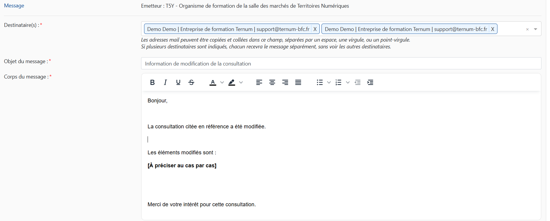 Par défaut, les adresses mails des entreprises ayant retirées le DCE sont reprises dans la case "destinataire".