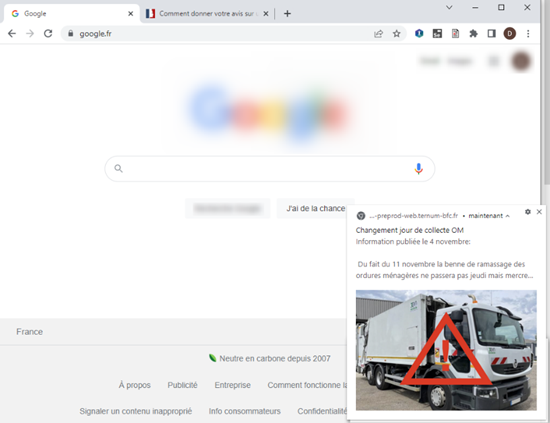 Les notifications vers les navigateurs (push web) sont des messages qui peuvent être envoyés à un utilisateur à partir de votre site CmonSite. Il s’agit de messages qui apparaîtront en bas à droite de l’écran, ou comme une notification d’application sur un téléphone mobile.