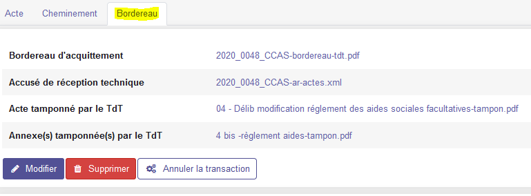 Cette section présente la procédure vous permettant de récupérer le bordereau de télétransmission dans Pastell. Ce document apporte la preuve de la transmission au contrôle de légalité. Il doit être joint à la version papier de l'acte dans votre registre.