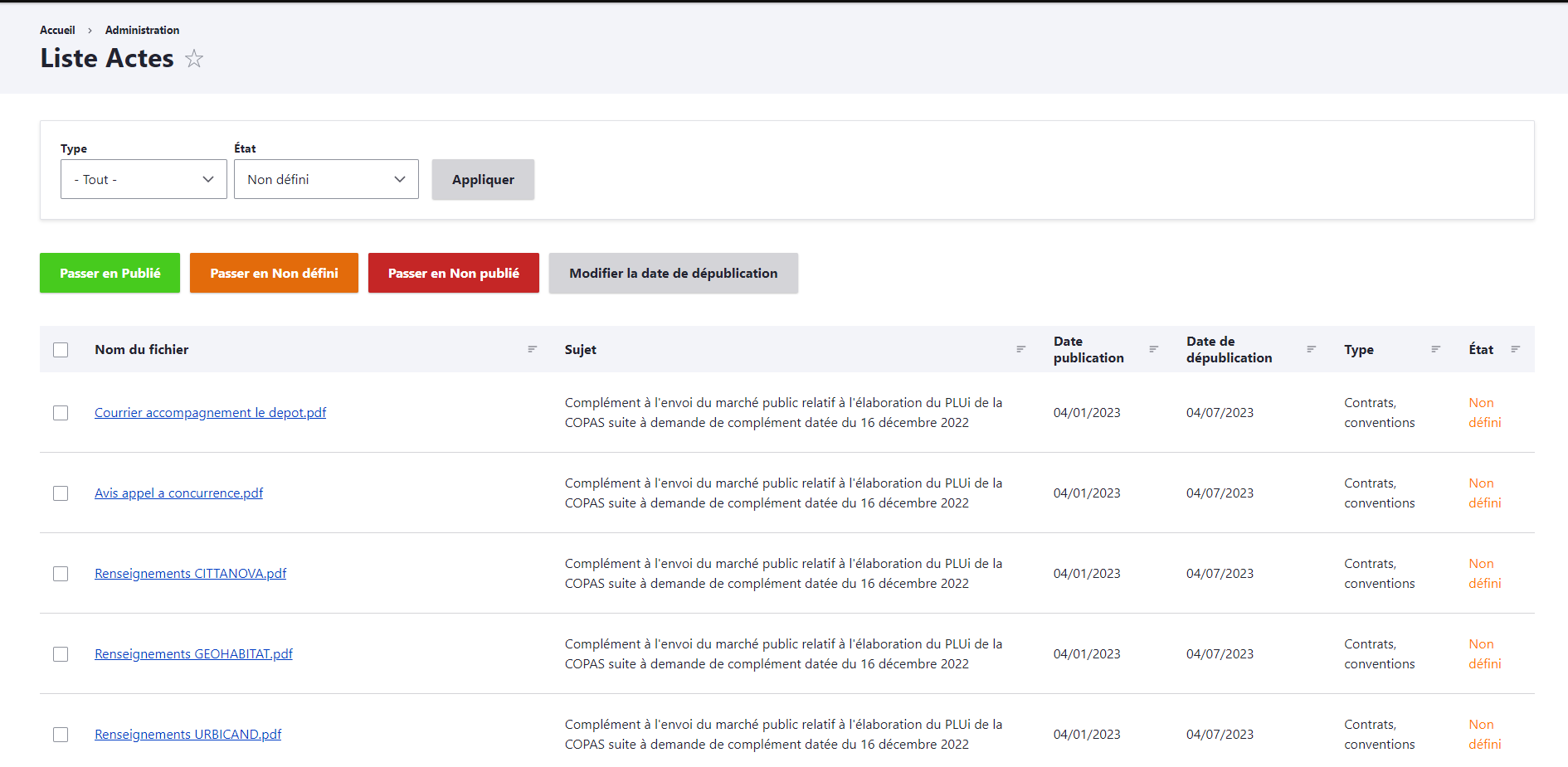 Rendez-vous régulièrement dans le tableau de bord pour publier ou dépublier manuellement les actes qui sont en statut "non défini".
