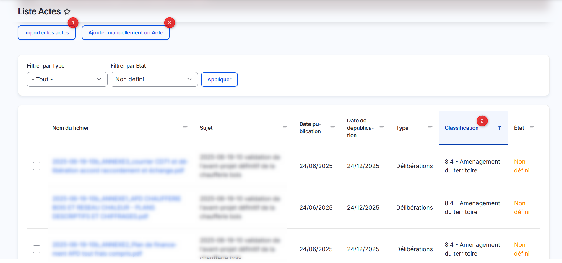 Depuis début juillet 2025 la Classification des actes est reprise (cf 2 sur la capture écran). Elle permet de filtrer par classification existante par les usagers qui visitent votre site.