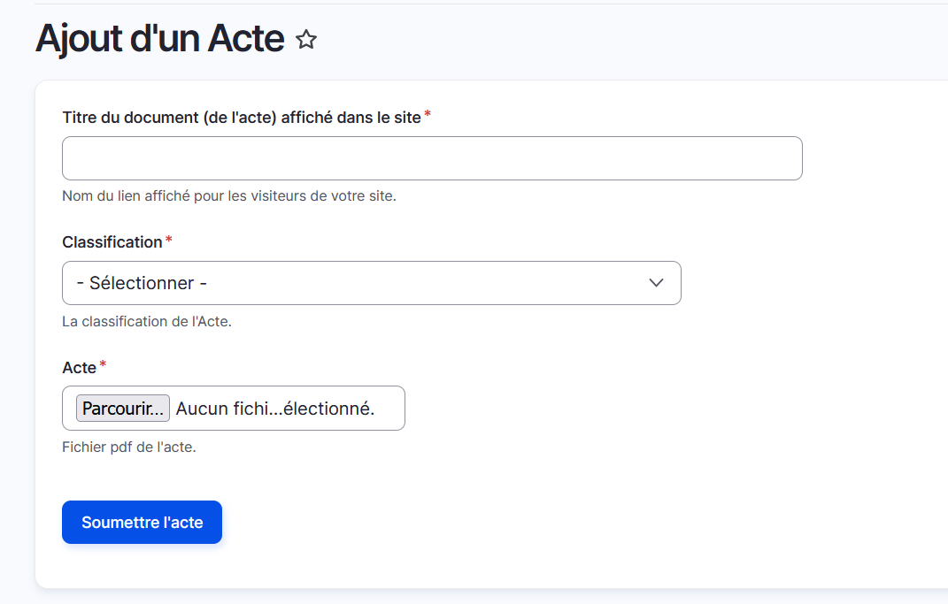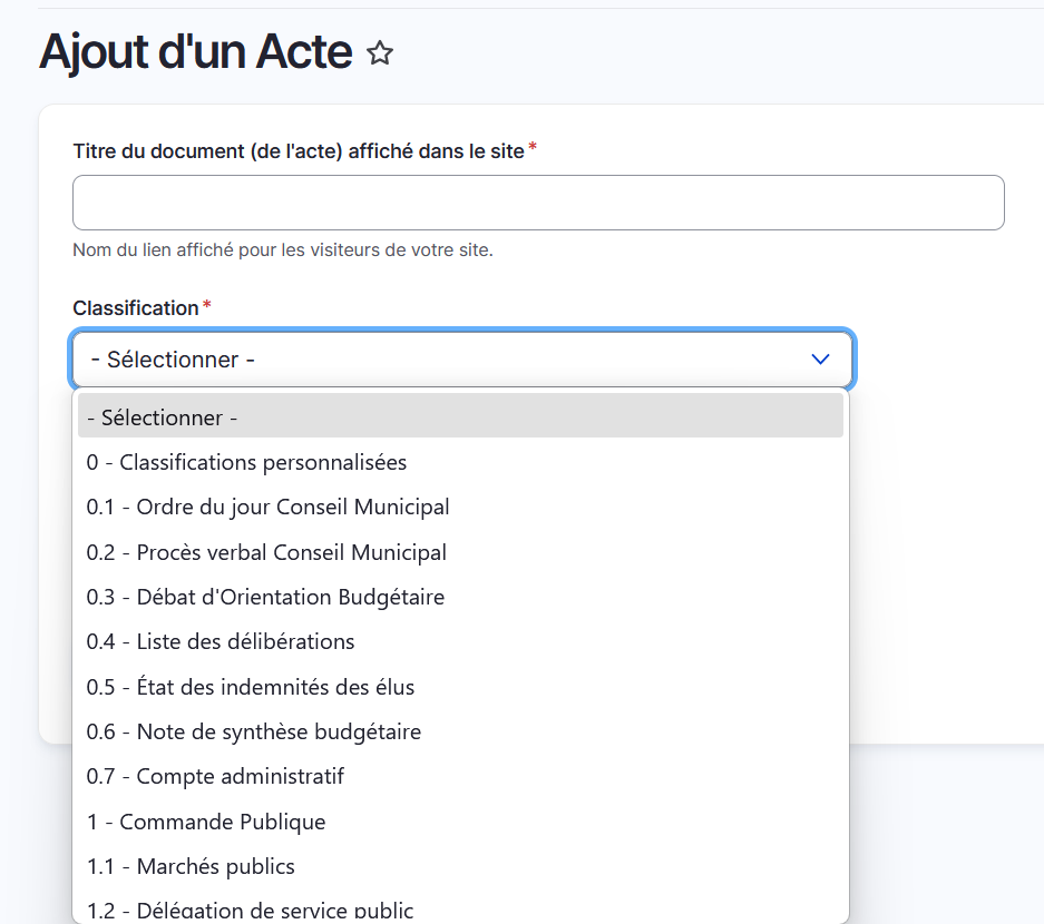 Il vous suffit de donner un nom qui sera affiché dans la liste des actes, choisir une classification, et le fichier pdf concerné.