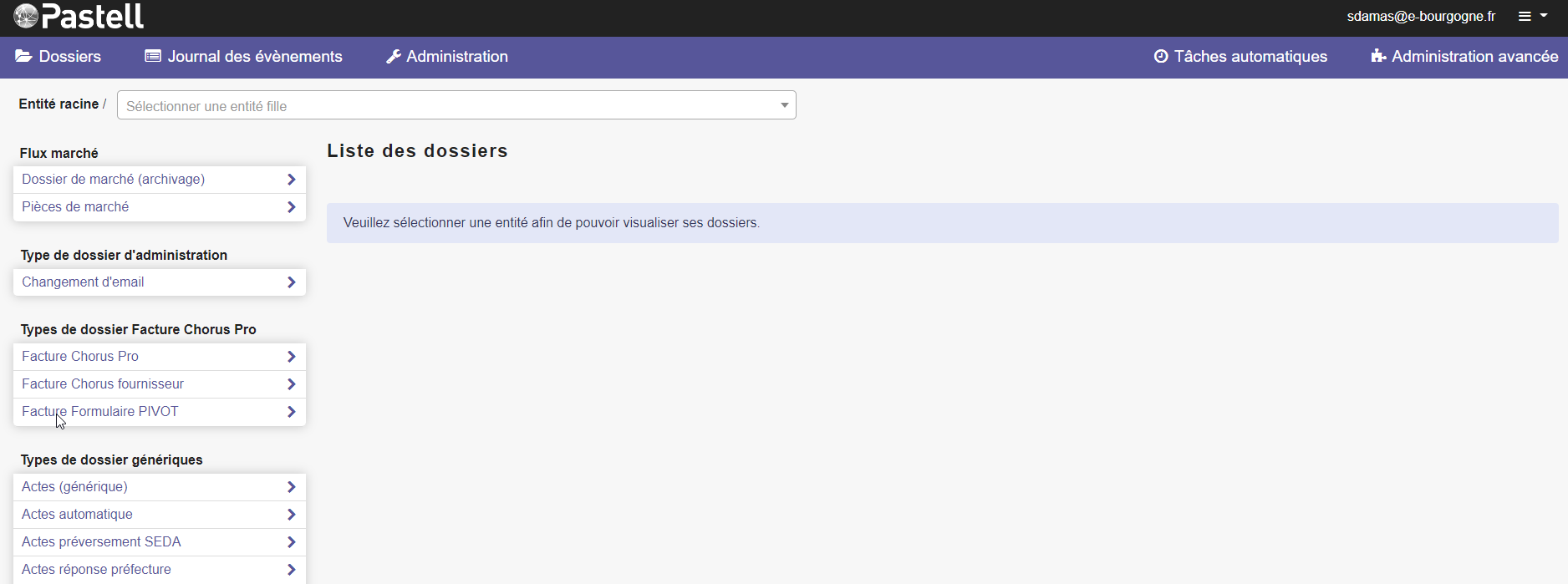 Ensuite, votre compte utilisateur doit disposer de droits sur Pastell. Ces droits peuvent être donnés par l'ARNia BFC ou par l'administrateur de votre collectivité.