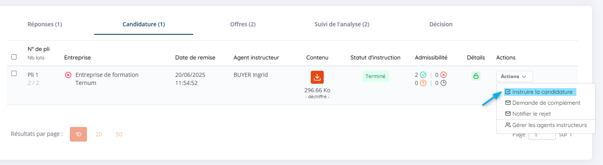Pour cela, cliquez sur le bouton "instruire la candidature" qui se trouve dans "actions".